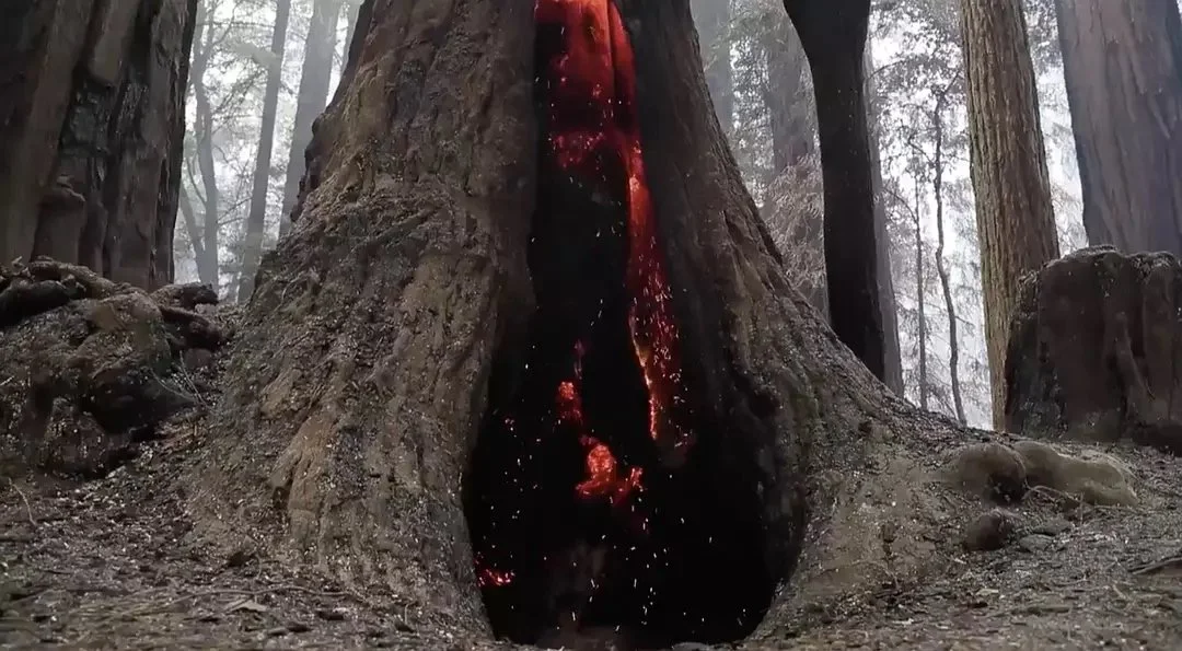 在Big Basin Redwood燃烧的redwood来源于推特 The image of burnning redwood at Big Basin Redwood from Twitter