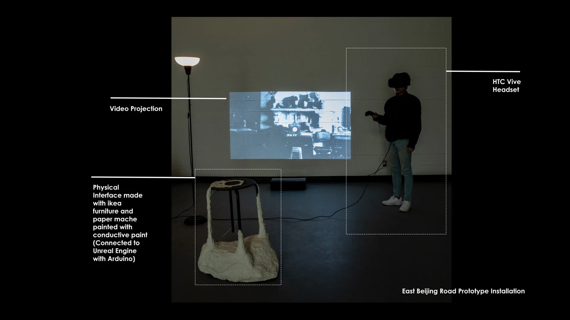 East Beijing Road is an asymmetric VR installation that reimagines the stories of a building with a history spanning over 100 years in Shanghai, China, whose residents were compelled to move out due to an ongoing gentrification policy. The project addresses the perceptions of the past and present, the fluidity of archives, and the meanings of ruins. A syn- thetic space was reconstructed based on 3D photogrammetry models captured in this building. The audience, both inside and outside VR, must use distinct interfaces and experience different visual presentations to collaboratively unfold the story. Old and new, digital and analog, real and fictional, and virtual and physical elements interweave. The asymmetri- cal design in interactive storytelling blends different times and spaces, allowing the re-enactment of the past through audience collaborative actions, raising questions about the relationship between interactivity and the visibility of the past. Asymmetry VR can be defined as “co-located users access the same virtual environment using different kinds of technology”. This project deploys the characteristic of asymmetric VR and provides an experience of unstable, unbalanced, and incomplete information among audiences inside and outside VR. The imbalances and incompleteness in media design are a metaphor for the fragmented time and space inherent in the archival practice of unveiling the past in the digital epoch. No complete information is visible with- out collaboration between the audiences inside and outside VR. It is an embodied experience that the past can only be revealed through collaborative interaction. The story of the building on East Beijing Road becomes a form of repertoire because of the collaborative engagements of the audiences.